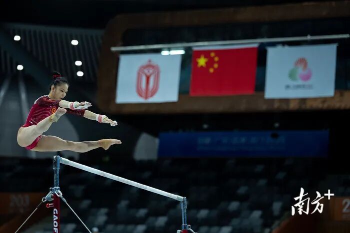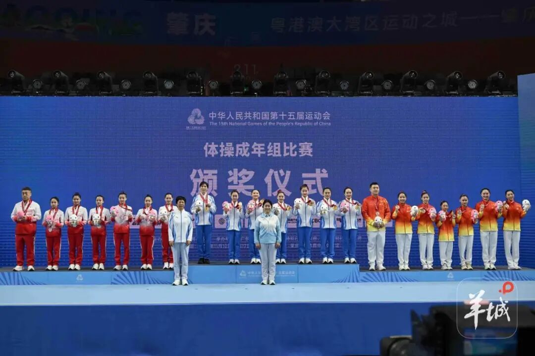 11月13日晚,十五运会体操成年组女子团体决赛在肇庆新区体育中心体育馆上演。经过两个半小时的比拼,预赛排名第一的浙江队与排名第二的广东队紧咬比分,鏖战到最后一轮、最后一套。最终,由柯沁沁、钟圻、欧钰珊、彭子金、胡嘉菲、黄紫艺组成的广东队以209.426分,与浙江队0.002分之差遗憾摘银。