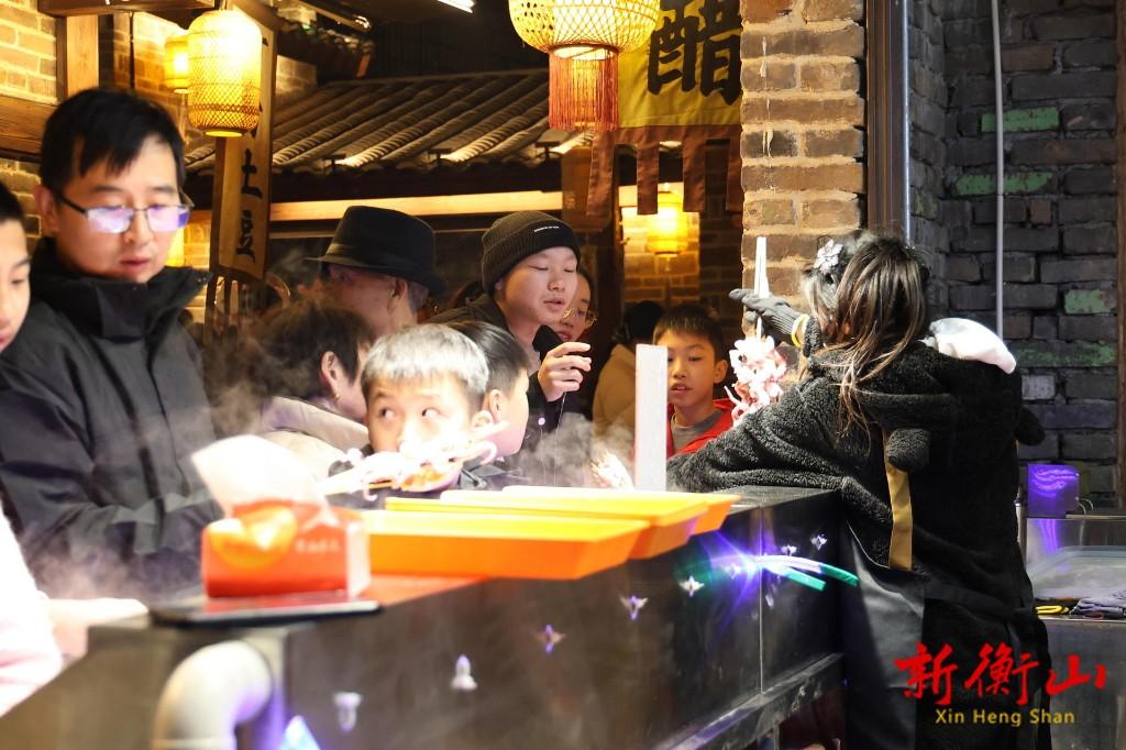 景区的火爆直接带动了商户生意兴隆。市井烟火区内,一米大肉串、渣江鱼粉、手工鱼丸等百余种特色小吃集中亮相,多个摊位前排起长龙。衡山渡粉面组负责人王凯表示:“通常上午10点至中午1点,下午6点至9点的时候,现场非常火爆,基本是供不应求,夸张点说要抢着才能吃到。”