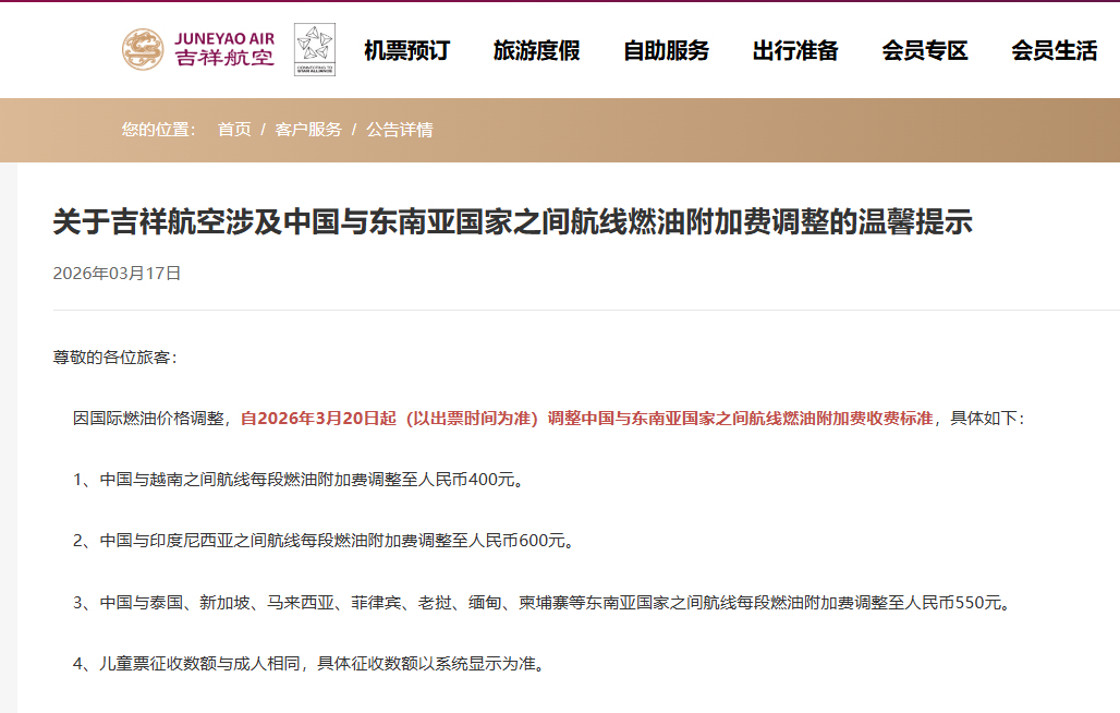 3月17日,吉祥航空官网发布温馨提示称,因国际燃油价格调整,自2026年3月20日起(以出票时间为准)调整中国与东南亚国家之间航线燃油附加费收费标准。