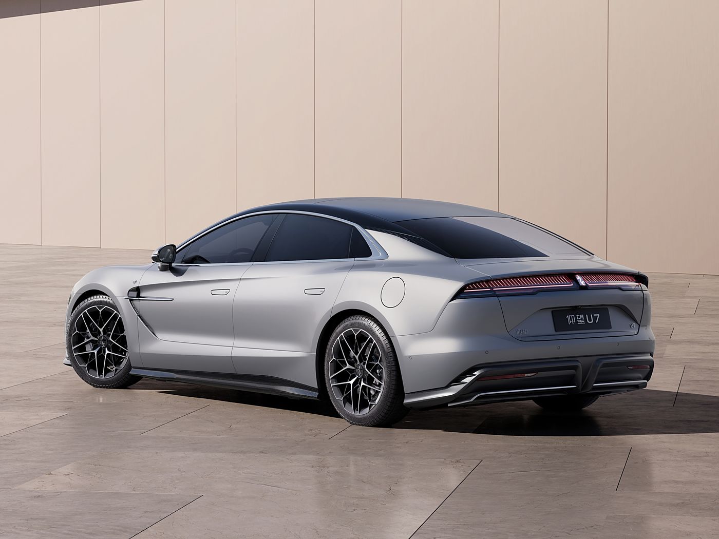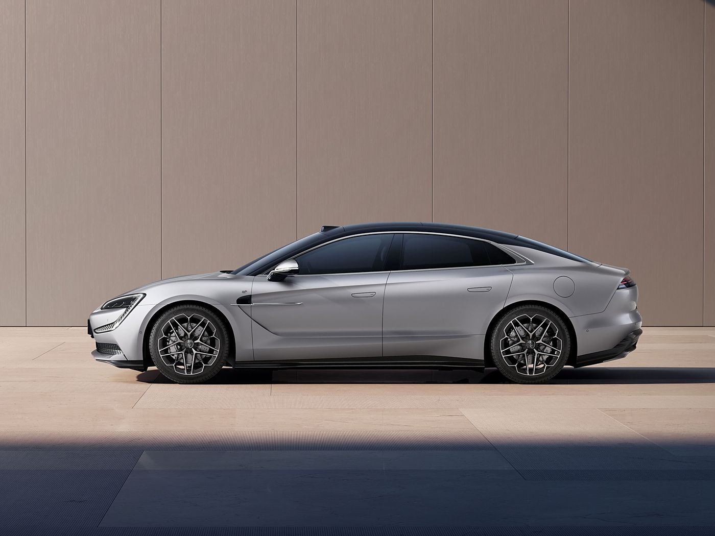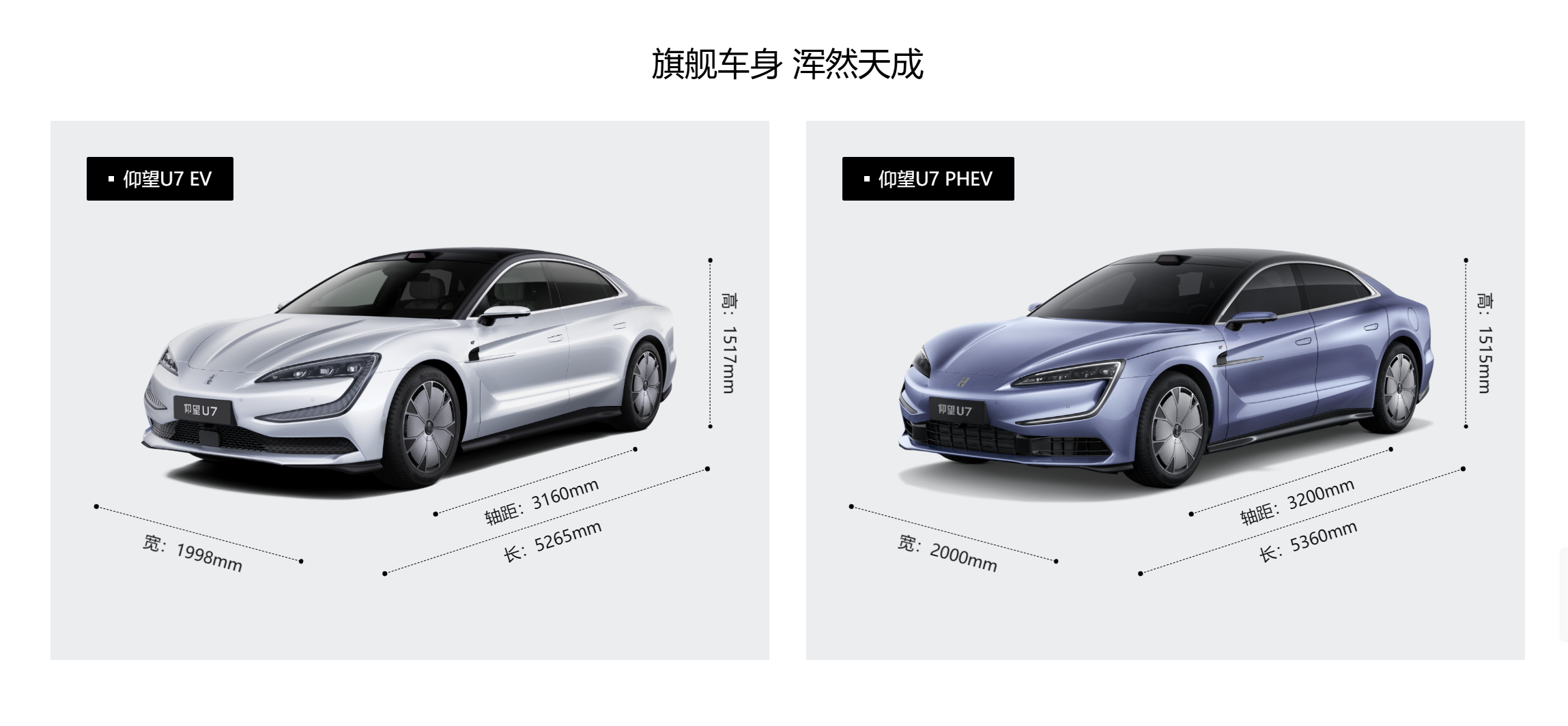 车侧造型非常修长,一看就知道这是一台新能源车。细节方面,低风阻造型的大尺寸轮圈、隐藏式门把手都没有缺席。尺寸方面,纯电版的长宽高分别为5265/1998/1517mm,轴距为3160mm;插混版长宽高分别为5360/2000/1515mm,轴距3200mm。