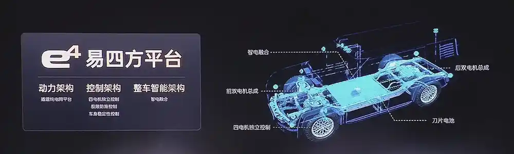 动力方面,新车的看点也很多,我们先看纯电版。纯电版配备了四台电机,总功率达到了惊人的1306马力,零百加速只要2.9秒,这个数据基本上可以秒杀路上的所有车了。它还搭载了高性能刀片电池,CLTC工况续航720km;插混版最大的看点肯定就是2.0T水平对置发动机了,与此相搭配的是四电机,其中发动机最大功率245马力,电机最大功率也是1306马力,纯电续航200km,综合续航超1000km。