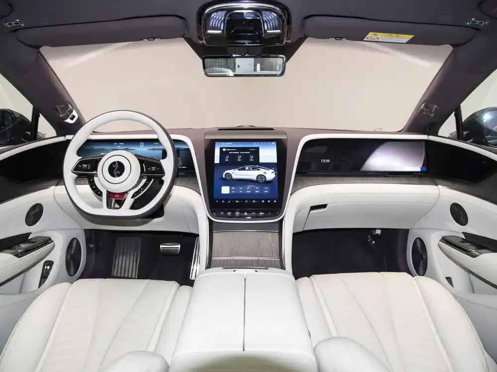 来到车内,新车的设计一看就知道其旗舰的身份。中控台采用了对称式设计,中控屏为竖状设计,两侧则是内嵌式液晶仪表+副驾娱乐屏,后者也是目前用户比较喜欢的配置。