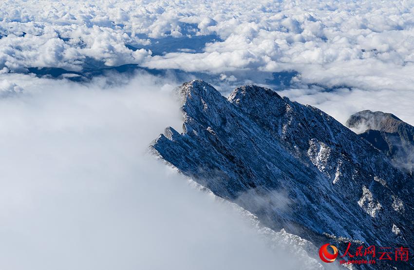 更令人惊奇的是,借助无人机从苍山顶上航拍,200公里之外的丽江玉龙雪山也出现在镜头里,两山雪景在云海之上浪漫“邂逅”,场面十分壮观。